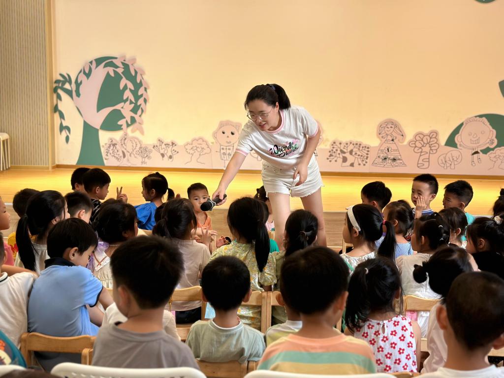 紧接着,汤霞敏老师采取了一种有趣的方式与幼儿进行互动,让孩子们做实践队小老师们的“老师”。而对于暑期社会实践队的成员,汤霞敏老师则希望他们能够在实践中有所感悟,并检验平时所学、学以致用。
