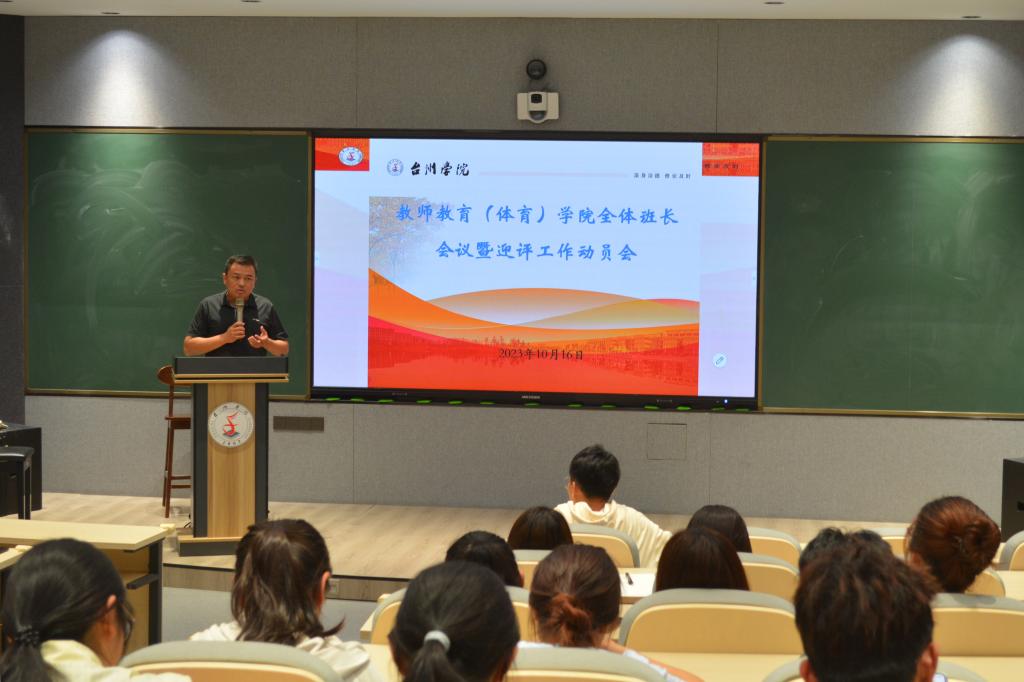 10月16日下午,教师教育(体育)学院在A6智慧教室召开学生干部大会暨迎接本科教育教学审核评估工作动员会。院党委副书记吴磊出席会议并讲话,辅导员阎宝莹、朱佳婧、梁鎱及全体班长参加会议。