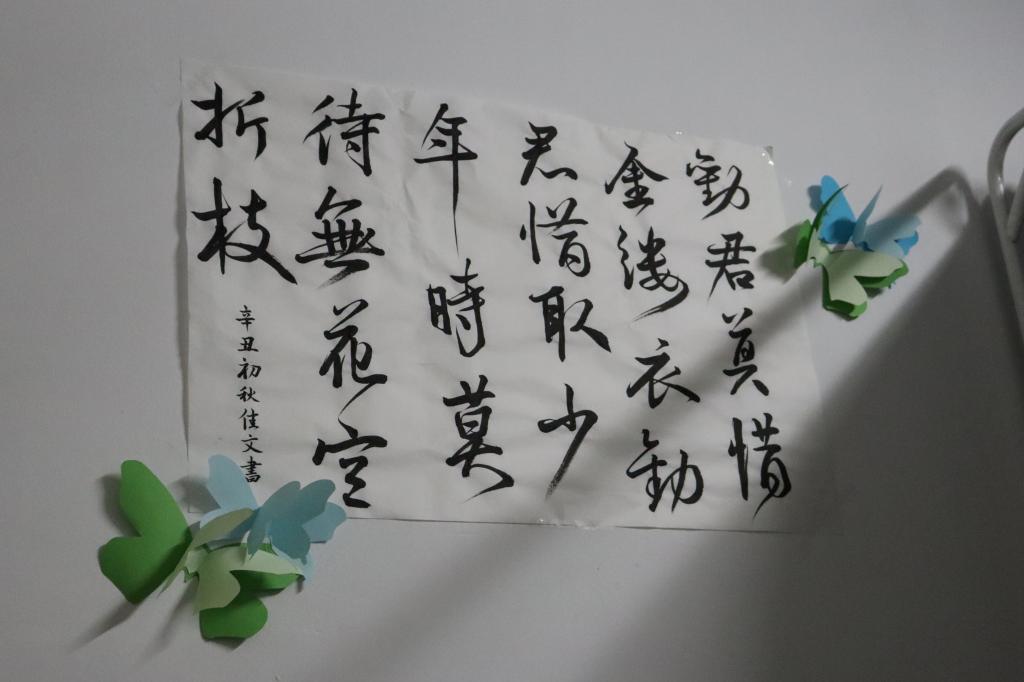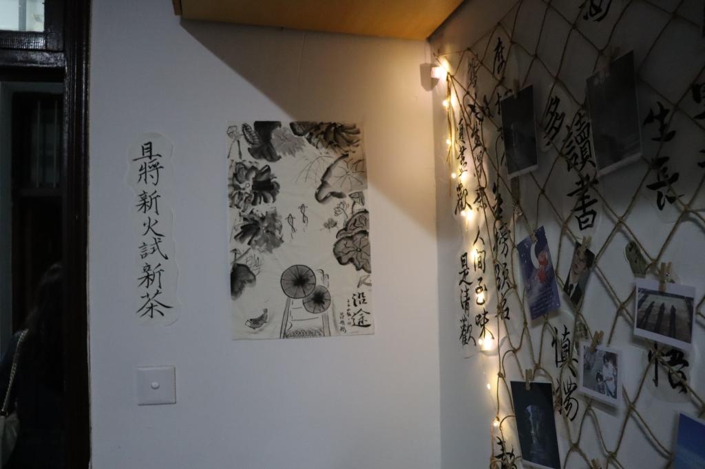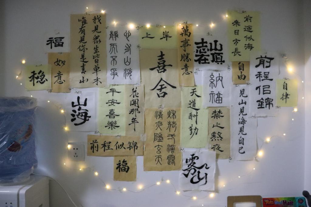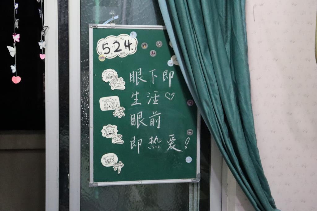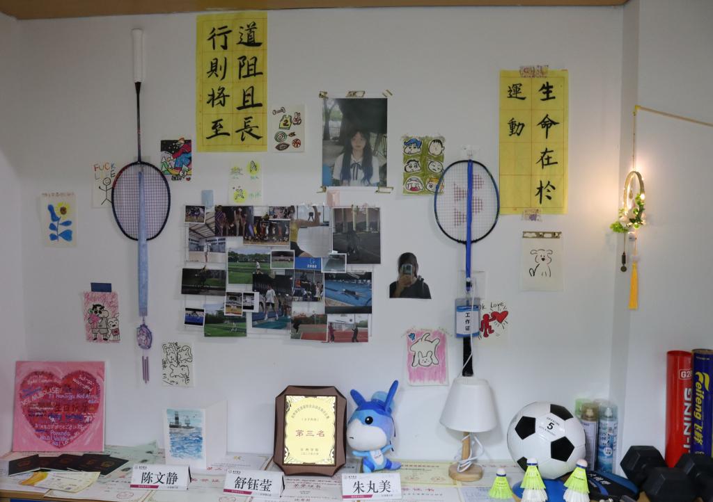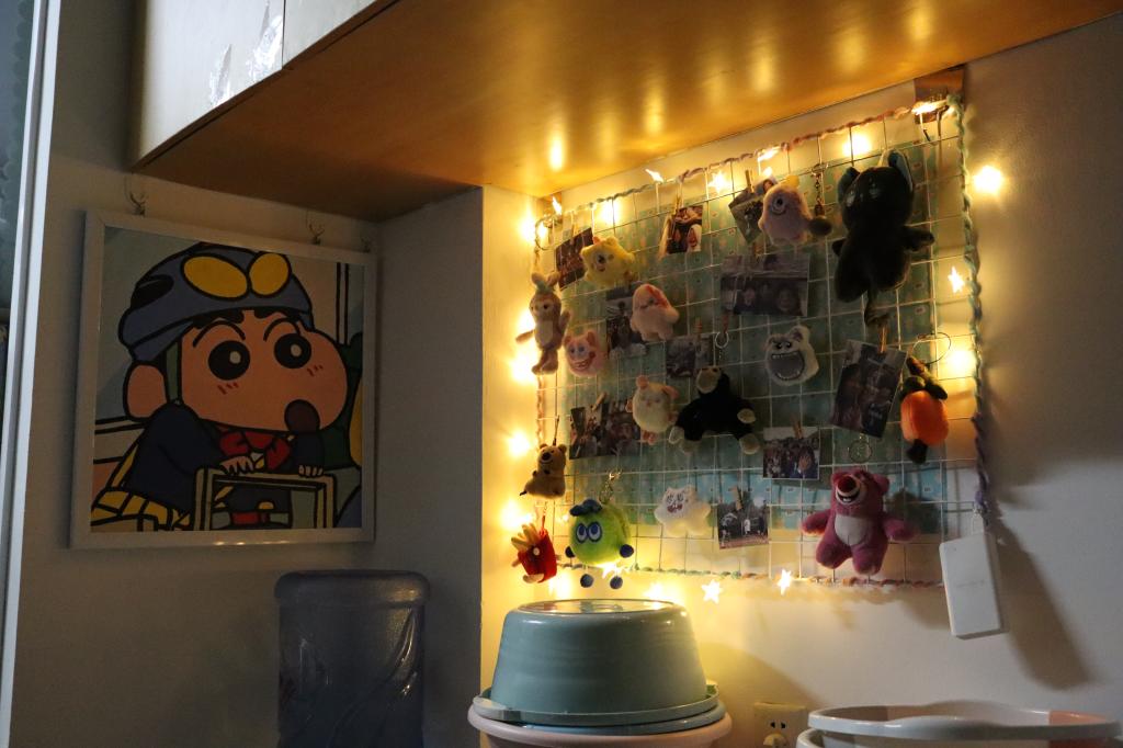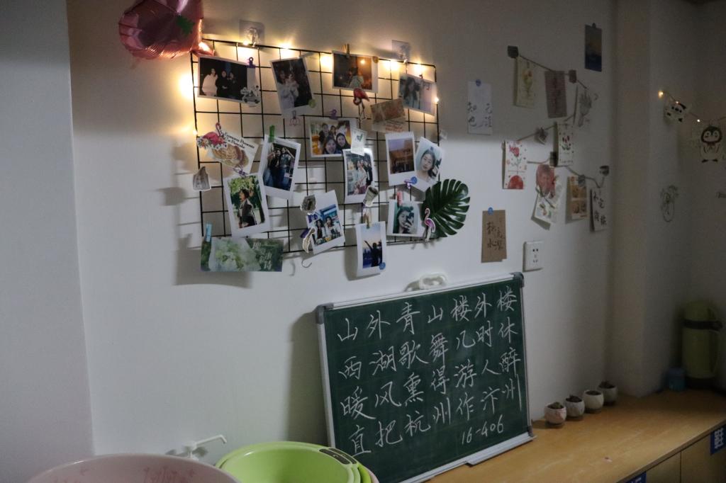 每个寝室都为准备本次评选卯足了劲。寝室的墙上挂满了别出心裁的装饰,有亲手制作的草编艺术,也有妙趣横生的娃娃玩偶,还有龙飞凤舞的书画作品。而本该空荡荡的天花板也挂满了各类饰品,有气球制成的鲸鱼,激励自我的标语,各式各样的吊灯。这些凝聚了全寝智慧的装饰为寝室增添了无限的色彩与生机。