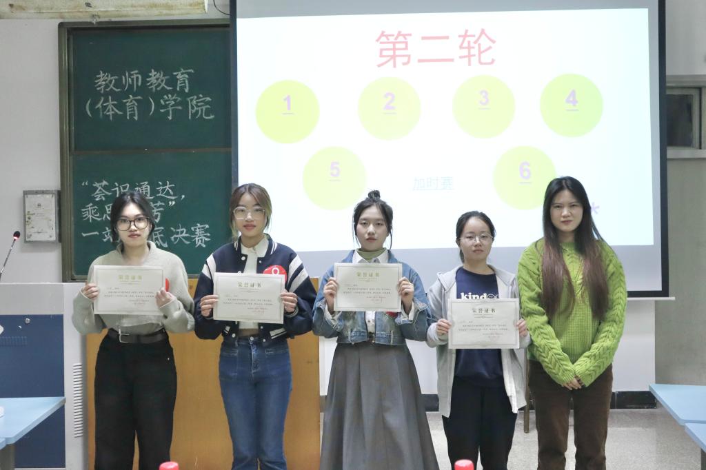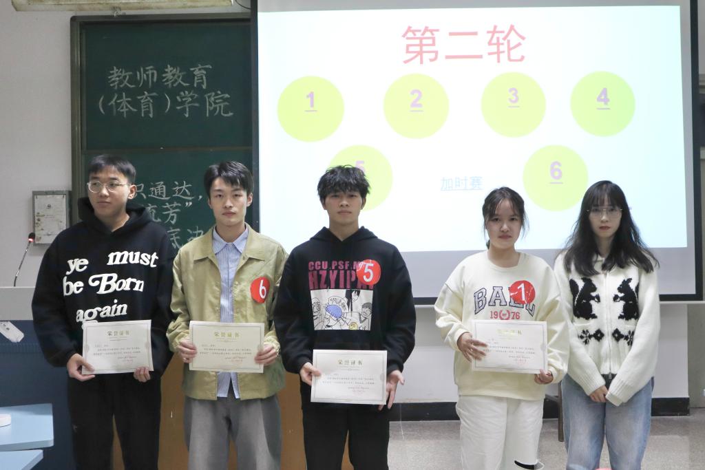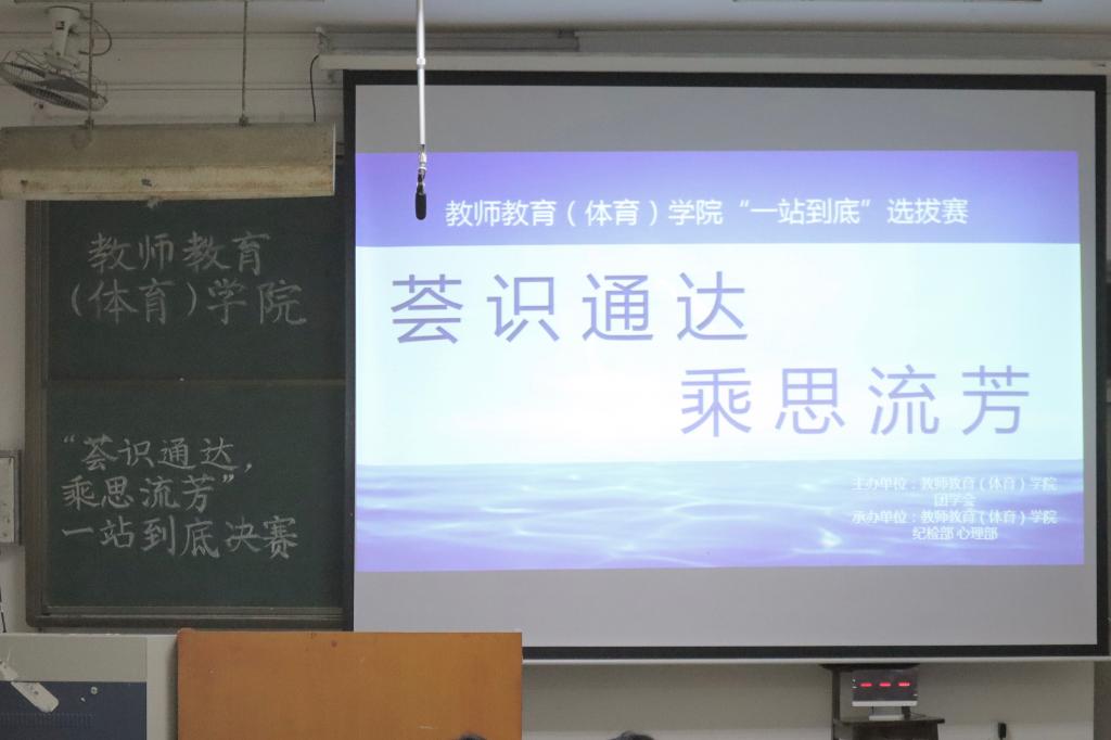 为了充实校园生活,增强大学生的文化自信,展现蓬勃向上的精神面貌。11月12日晚,教师教育(体育)学院于A1教室举办“荟识通达,乘思流芳”一站到底决赛。参加本次大赛的有辅导员朱浩楠、屈佳妮,8位选手以及各班观众代表。