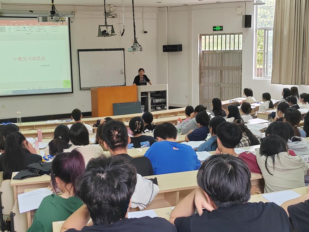 为安排好见习各项任务,保证见习顺利地进行,4月28日下午,教师教育学院(体育学院)于A4阶梯教室召开2022级小学教育专业见习动员会。本次会议由朱卫平老师主持,2022级小学教育专业全体学生参与。