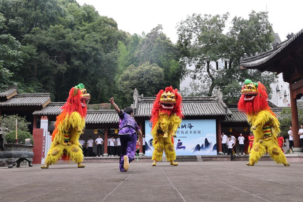 来自教师教育(体育)学院21级体育教育专业全体学生以及校舞龙舞狮队、校武术队队员,身着传统武术服饰,精神抖擞地列队站立,在樊坤老师的带领下,行抱拳礼,读《武德训》,习缩山拳法。缩山拳是浙江省省级非物质文化遗产,浙江地区最古老的拳种之一,戚继光的戚家拳和陈式太极拳都深受其影响,缩山拳节奏明快,一招一式,刚强有力,虚实分明,展演者的一招一式无不尽显中华之仪、强武之魂,为现场观众带来一场视觉与精神的双重盛宴,赢得了阵阵掌声。紧接着,技艺精湛的台州学院龙狮队伍跃入场内,伴随着锣鼓声,龙狮舞动生风,栩栩如生,将现场气氛推向高潮。