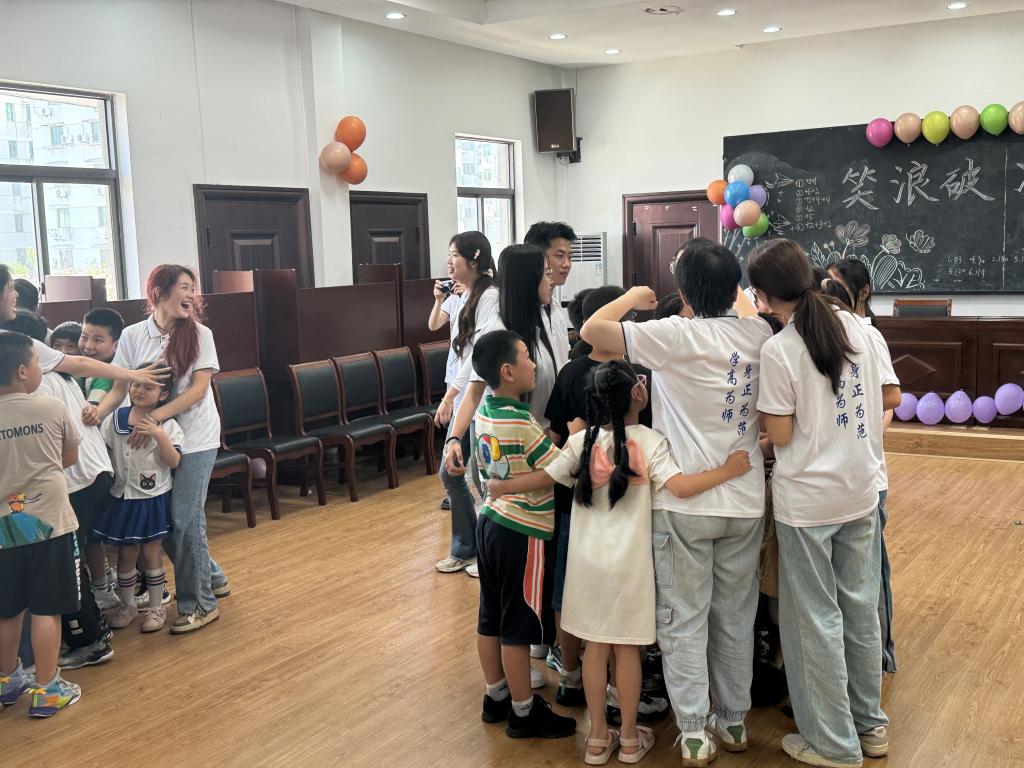 为了打破实践队员和孩子们之间的陌生感,队员们举办了破冰活动,通过一系列妙趣横生的团队游戏,初步认识了彼此,增强了队员和孩子间的信任感,促进了沟通。破冰活动在主持人的宣布下拉开了帷幕,队员和孩子们被分成六组进行游戏。现场欢声笑语不断,气氛热烈而温馨。