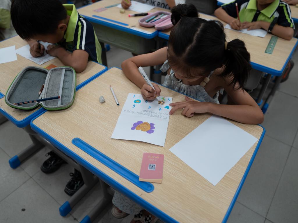 实践队员们初来乍到,为打破队员们与孩子们之间的坚冰,并让兴趣课程活动取得学校教师与家长的充分信任,他们带领各班学生为其班主任和家长制作爱的贺卡。孩子们略显稚嫩的贺语,却饱含着浓浓的温情,使课堂充满了温暖。