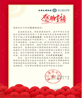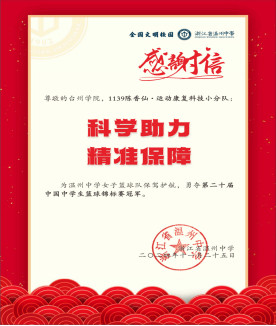 近日,浙江省温州中学向我校及陈香仙教授本人发来感谢信,信中对陈香仙运动康复科技团队的科技助力充满了赞誉和感激,在温中女篮摘得全国桂冠创造历史的征程中做出了突出贡献。