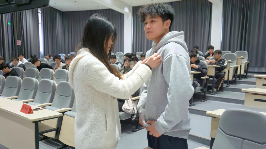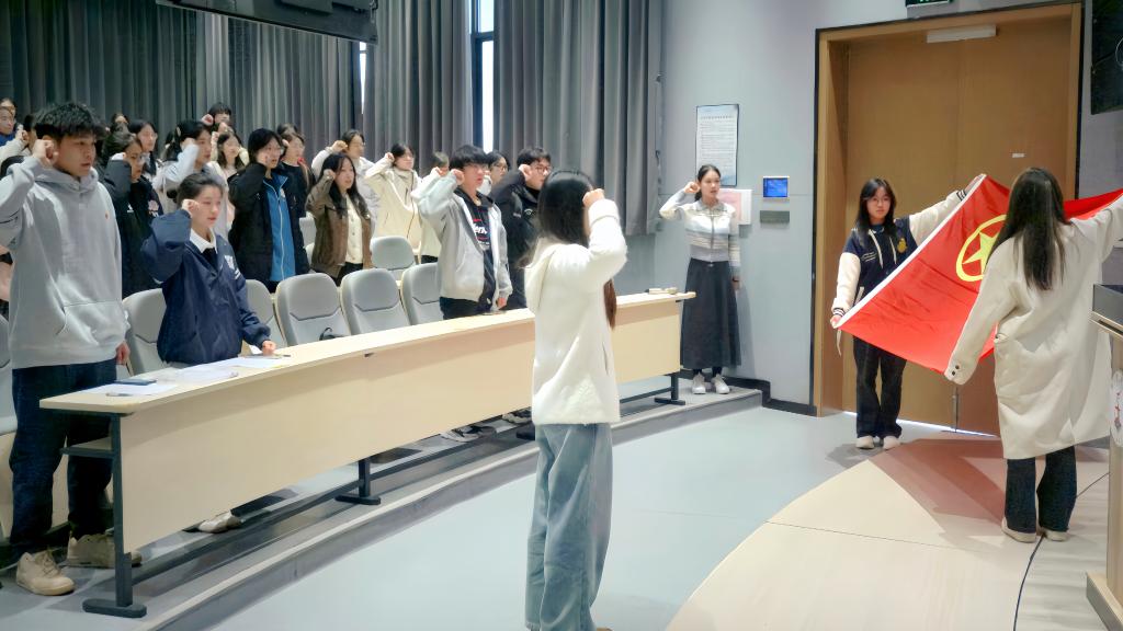 仪式在激昂的国歌声中正式拉开帷幕,歌声嘹亮,饱含着同学们对祖国的热忱与敬意。曲毕,主持人宣读新团员名单。经过严格的考察与选拔,共有91名同学成为了光荣的中国共产主义青年团团员,为团组织注入新鲜血液。朱浩楠老师手执团徽,为新团员代表郑重地佩戴,金色团徽在胸前熠熠生辉,象征着的责任与担当就此传递。新团员们面向团旗,握拳宣誓,誓词铿锵有力,荡气回肠。