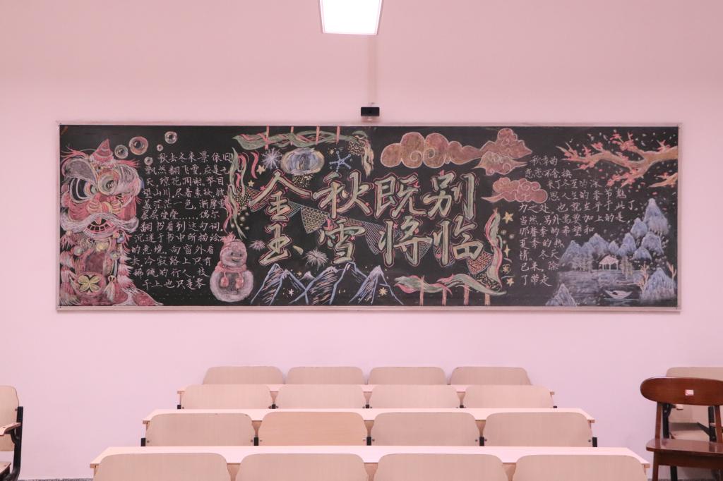 比赛中,各参赛学生小组热情投入,紧扣主题精心创作。有的小组以“金秋既别,雪将临”为主题,黑板上栩栩如生的雪花、憨态可掬的雪人,搭配着充满诗意的文字,仿佛将冬日的美景提前带到了校园。还有小组围绕“红心向党”展开设计,党徽闪耀在黑板中央,长城巍峨,文字激昂,传递出对党的无限忠诚与热爱。