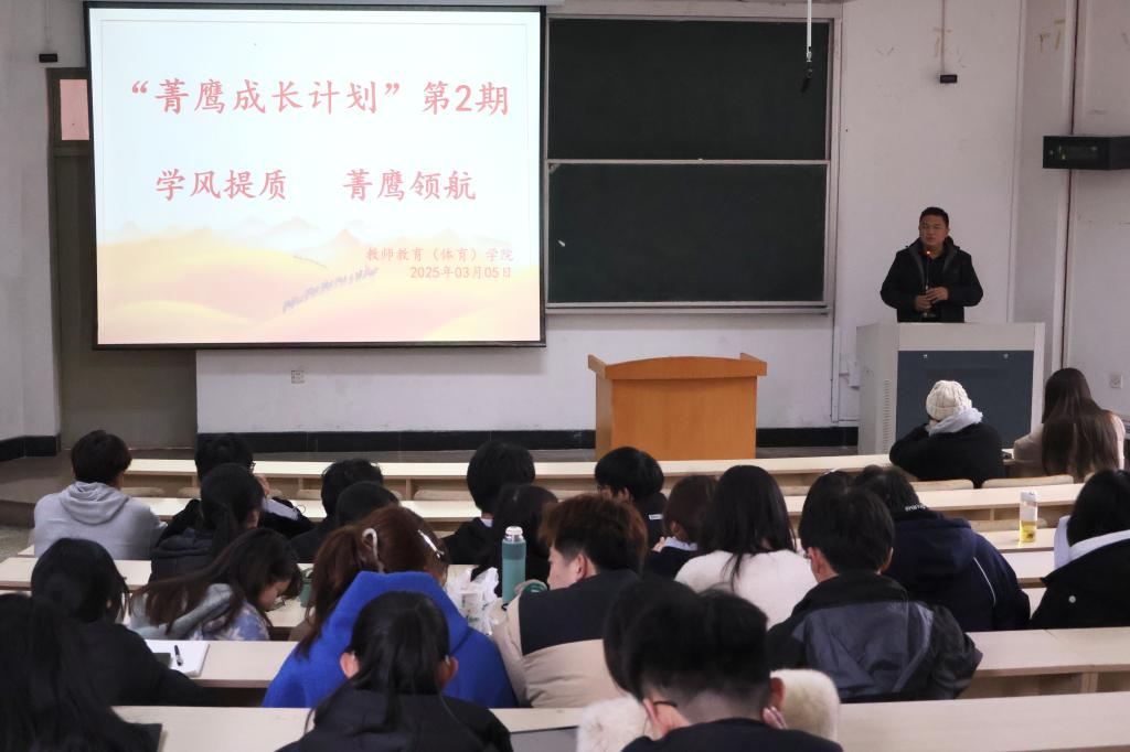 为进一步提升学生干部队伍综合素质,发挥好“头雁效应”,以优质学风建设推进“课堂革命”,3月5日中午,教师教育(体育)学院在A5教室召开“学风提质,菁鹰领航”学生干部大会。学院党委副书记吴磊、辅导员朱浩楠出席会议,团学会全体学生干部及全体班长参加会议。