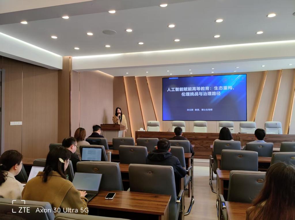 孙立新教授的讲座以人工智能重塑知识生产为背景,主要围绕高等教育的生态重构、技术应用的伦理困境、治理路径三个方面展开,揭示了人工智能重塑高等教育体系的样态,教学场景智能化跃迁、高等教育管理模式数字化转型以及科研范式智能化转型,同时也指出了运用人工智能面临伦理困境,诸如教育公平的结构性失衡、学术生态的信任危机、主体价值的解构风险,提出了建立“动态评估-协同治理-文化重塑”三位一体的治理体系,为高等教育智能化转型提供理论支撑与实践指南。