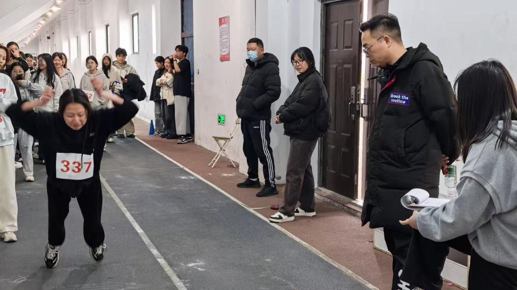 在测试赛期间,在各学院在书记与辅导员的带领下,按照既定安排有序抵达测试场地,为测试赛的顺利开展提供了有力保障。体育教师和学生裁判员们公正、公平的开展了执裁工作。在各个项目的测试区域,同学们都全力以赴。跑步赛道上,选手们你追我赶,尽管气喘吁吁,仍坚持冲向终点;引体向上区域,男生们咬紧牙关,不断挑战自我极限,努力完成更多次数;女生们在仰卧起坐项目中,节奏稳定,展现出坚韧的毅力;立定跳远场地,同学们奋力一跃,在空中留下一道道精彩的弧线。此外,学生志愿者们的身影随处可见,贡献了自己一份宝贵的力量。