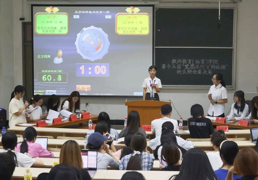 为提升同学们的思辨与表达能力,营造学院学术思辨氛围,推动校园文化建设,教师教育(体育)学院于A5教室举办第十五届“凭思正行,言辩纵横”新生辩论赛决赛。本次比赛特邀辅导员屈佳妮、朱浩楠,专任教师史和佳、李宇亮担任评委,刘叶同学担任主持。