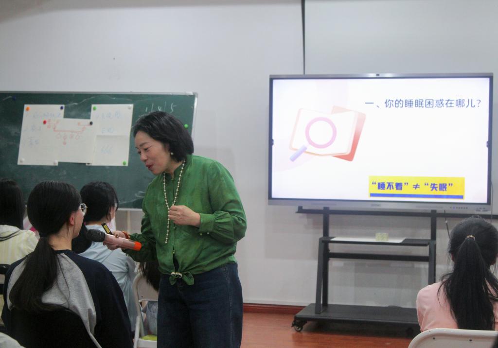 针对普遍存在的睡眠认知误区,金老师重点剖析了“必须睡满8小时才健康”等常见错误观念,强调认知行为疗法(CBT-I)在改善睡眠质量中的关键作用。通过典型案例分析与现场演示,详细讲解刺激控制、睡眠限制、认知重建三大核心干预技术,指导同学们建立“卧室-睡眠”条件反射、制定个性化睡眠计划、构建正向睡眠认知。在互动环节,师生们就“运动强度与睡眠关系”“考试前失眠”等问题展开热烈讨论。此外,金老师还介绍了认知行为疗法在改善睡眠方面的应用,她结合丰富的临床经验为同学们提供了一套系统、科学的睡眠改善方案。