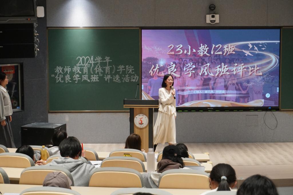 为进一步加强学院学风建设,营造积极向上、笃学力行的学习氛围,教师教育(体育)学院于11月2日晚在A6教室成功举办2024学年“优良学风班”评选活动。吴磊老师以及相关辅导员老师出席并担任评委,各班学生代表组成大众评审团参与评分。