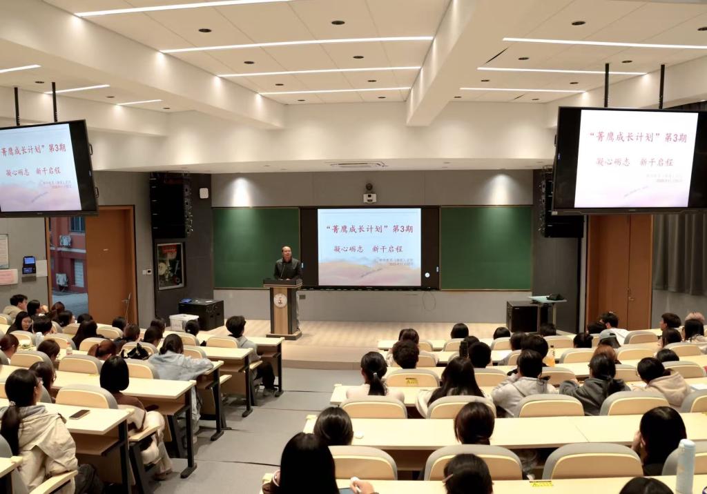 领航生涯规划,筑牢骨干根基,2025年11月5日,教师教育(体育)学院举办“菁鹰成长计划”第3期:“凝心励志,新干启程”,院党委书记林辉杰致辞,辅导员朱浩楠主持会议,团学会全体新干事参会。