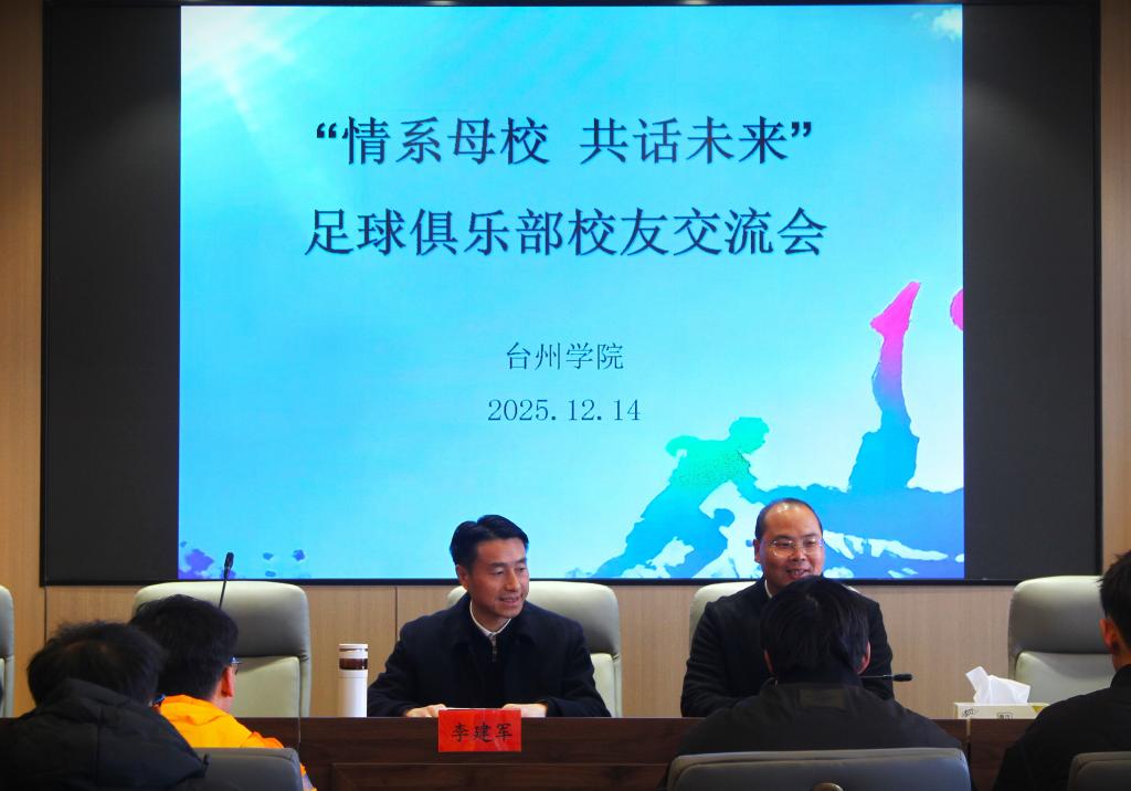 副校长李建军在“情系母校 共话未来”——足球俱乐部校友交流会上深情致辞,对校友们的到来表示热烈欢迎和诚挚的祝福。他提到两个关键词,一为“双向奔赴”:台院教师倾心育人、润物无声,学子勤学笃行、不负韶华,这份师生间的双向奔赴是众学子取得优秀成绩的根本原因。二为“薪火相传”:校友将台院的教育初心与育人精神传承融入本职工作,全身心投入教育,是真正的人民教师。李建军强调,一个老师想要成为一名卓越的人民教师,就要把职业变成事业,变成自己安身立命之所在、性命之所托、情感之所依。