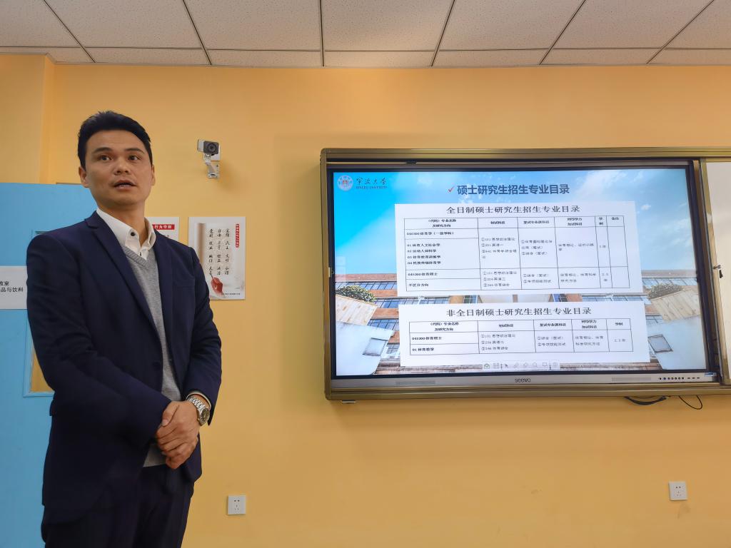 任峰向同学们具体介绍了宁波大学体育专业研究生培养的优势、教学内容、近年来的发展情况等,重点分析了当前体育专业考研的形式与政策。林辉杰总结时指出,宁波大学体育专业硕士研究生培养理念对于我院本科生的考研准备有重要引导价值;我院同学们要有信心、有恒心、有决心来准备考研,争取更高层次的发展;也希望同学们日后能够考入理想的学校,继续深造。