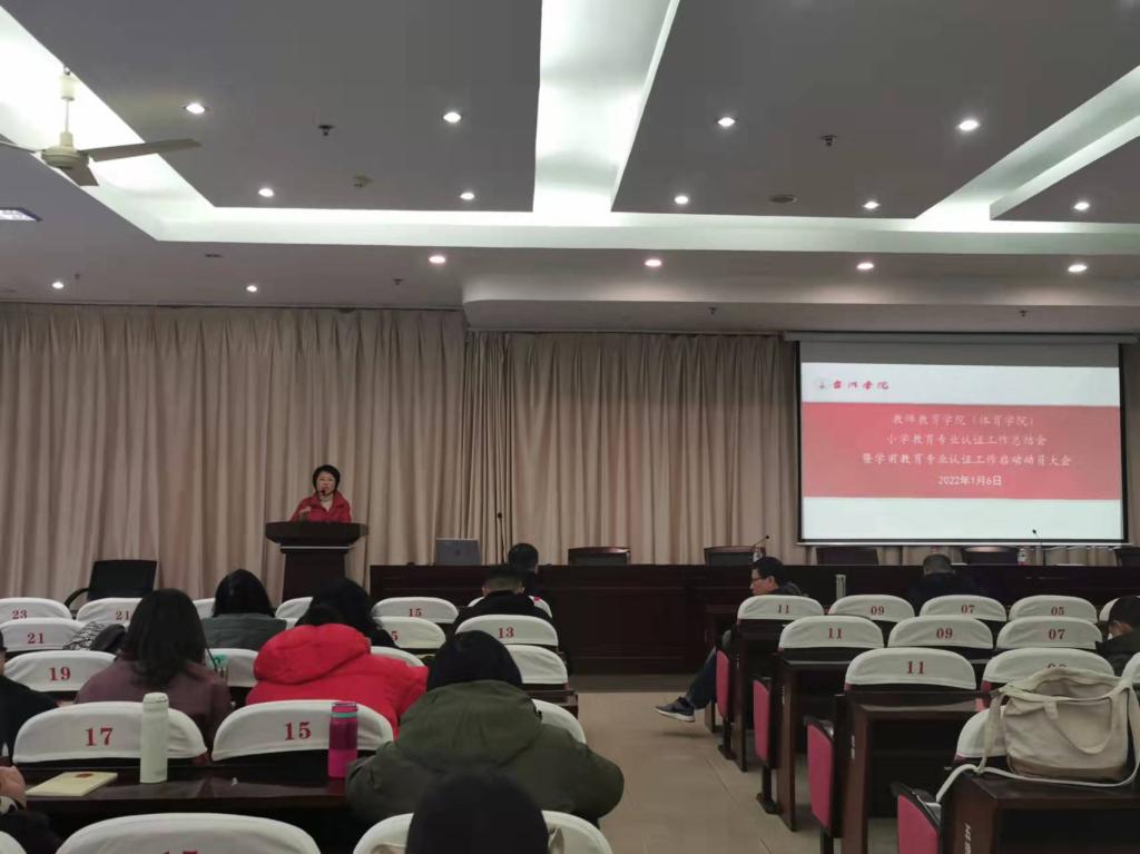 1月6日下午,教师教育学院在临海校区学术报告厅召开小学教育专业认证经验总结会暨学前教育专任认证工作启动会。学院领导班子、小学教育专业认证骨干、学前教育专业全体专任教师出席会议,会议由吴银银副院长主持。
