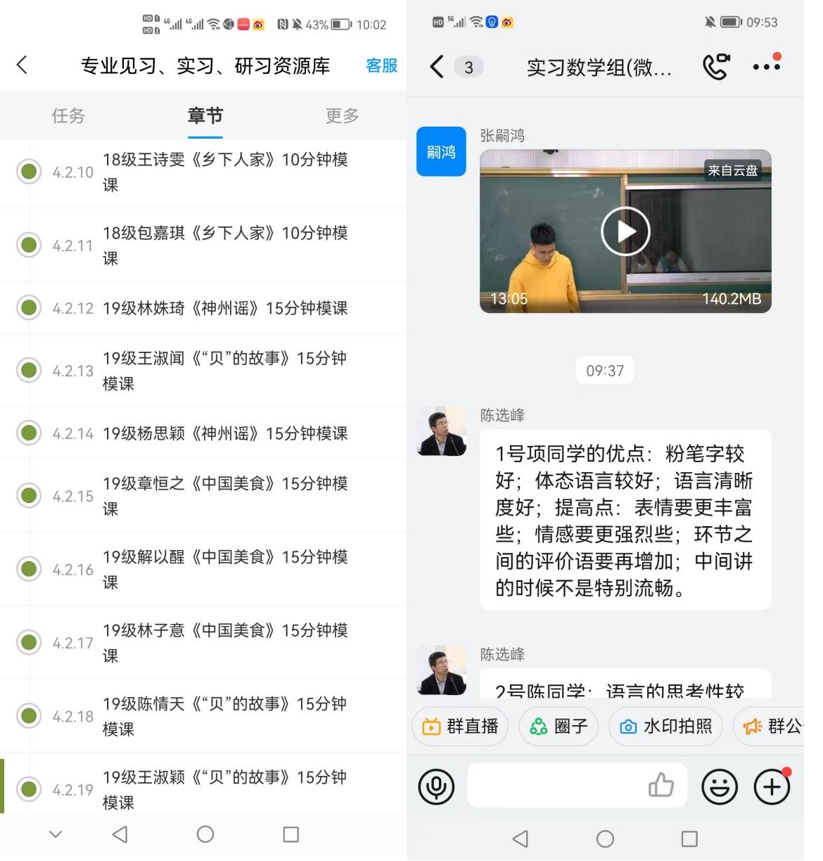 线下与线上双轨并举,助力实习生们成长。在线下实习方面,主阵地由小学转至台州学院校内。实习活动中,受邀的台州市名师与高校指导教师结对,共同对校内的实习生们进行教育实习指导;具体实践中,实习生们会把优秀的模课视频上传至学习通平台,进行资源共享,每周小组内的教研活动都如火如荼地展开。在线上实习方面,名师与高校指导老师结对进行实习生们的模拟上课指导,加之张桂梅、张玉滚和支月英等感人先进教育事迹和全国优秀主题班会视频的观摩,实习生们收获颇丰,纷纷撰写了感悟。此外,毕业生就业线上分享会、国家中小学智慧教育平台及台州学院小教专业实习资源库等优质网络资源都为此次线下+线上的实习新模式提供了必要的学习资源保障,为实习生们的成长厚植根基。